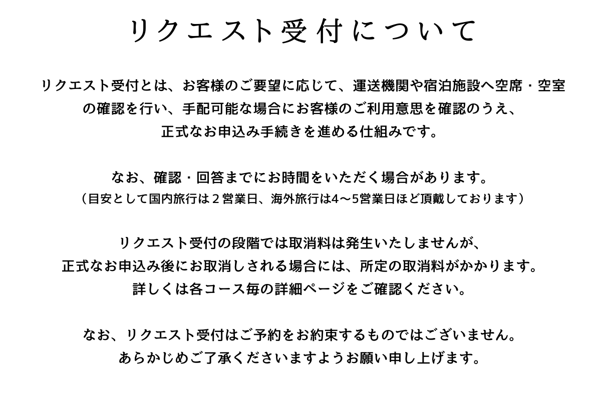 - ●:リクエスト受付 … お客様からの予約希望を受け付けた後に、運送機関・宿泊施設等に照会をさせていただきます。お座席・お部屋が確保された場合に正式にお申込みとする受付です。当社からの回答に1〜2営業日程度を要する場合がございます。